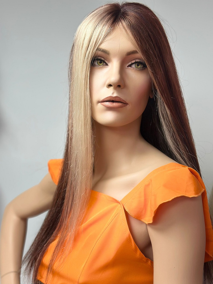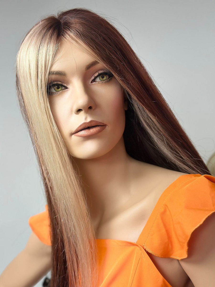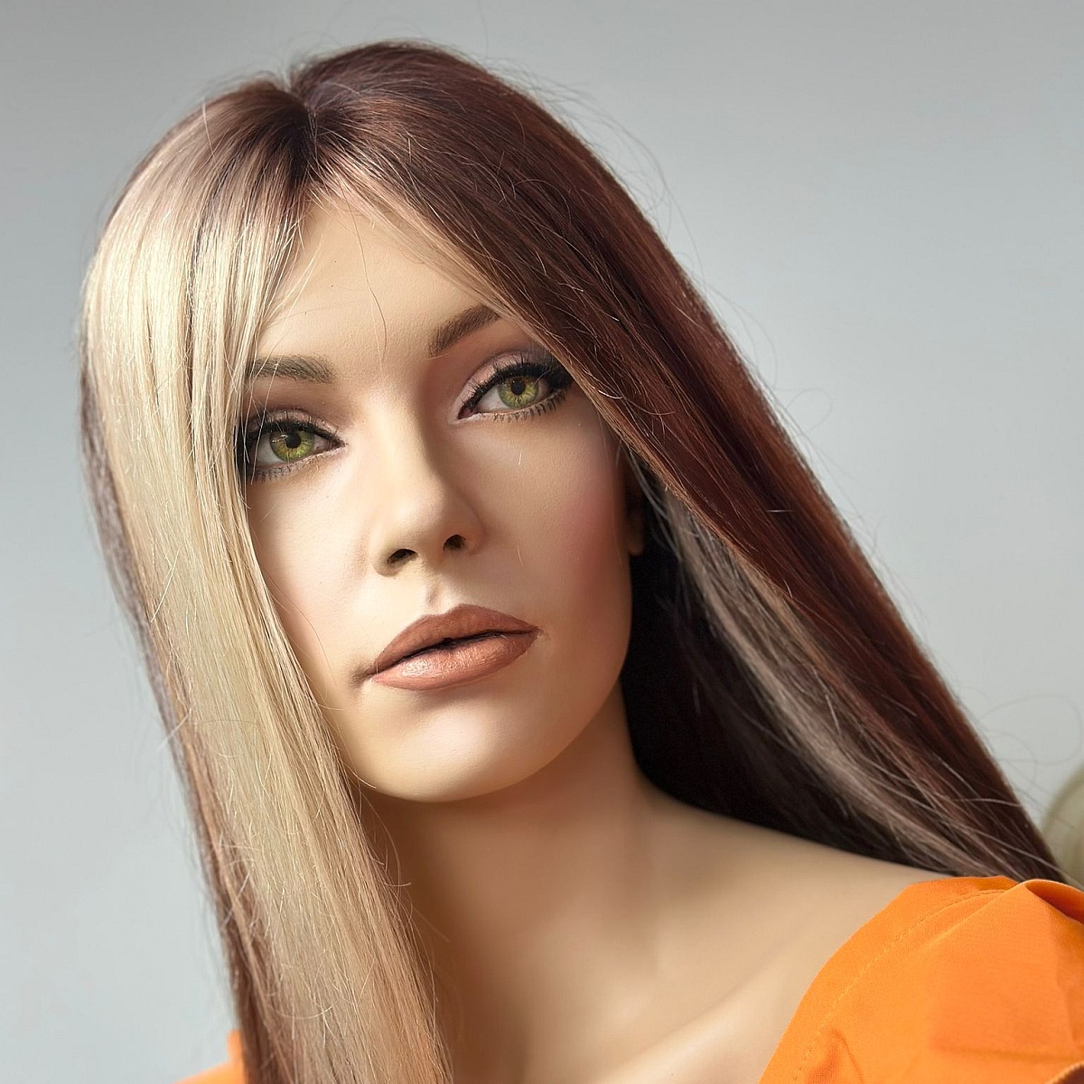 Hand-painted lips, eyeshadow, eyeliner, blush, eyebrows, and subtle facial shading